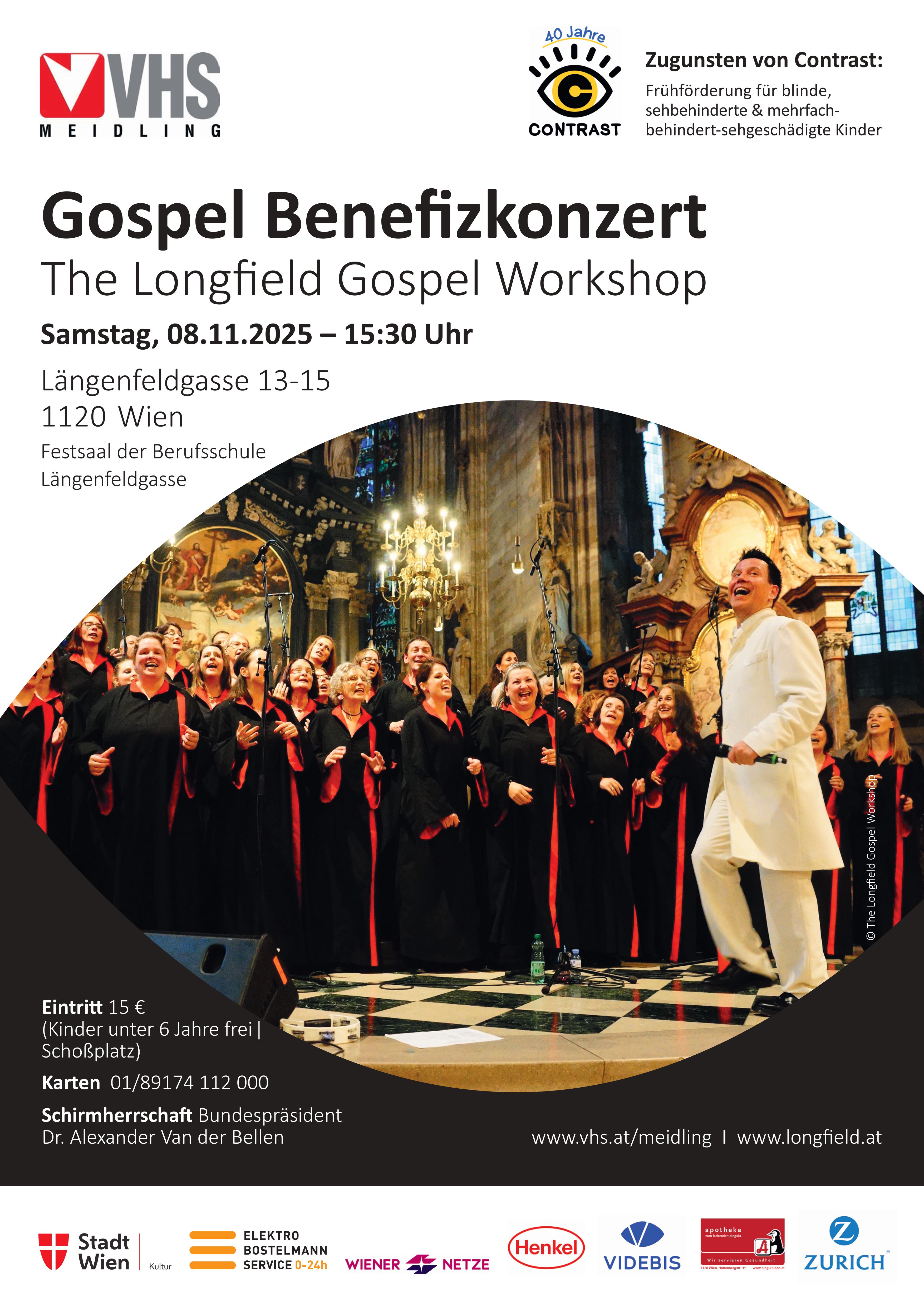 Das Benefizkonzert des LONGFIELD GOSPEL WORKSHOP im Theatersaal Längenfeldgasse fand am 12.11.2017 zugunsten des Vereins "Contrast" statt, der sich um Frühförderung für blinde, sehbehinderte und mehrfachbehindert-sehgeschädigte Kinder kümmert. Weitere Informationen zum Verein gibt es unter www.contrast.or.at.